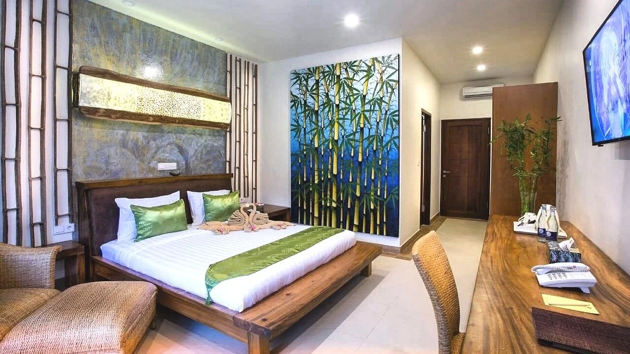 Furnished with Suar wood which has unique patterns and diverse shades of brown and floored with natural marble these rooms elegantly blend the warmth of natural woods and charm of a tropical island with luxury.