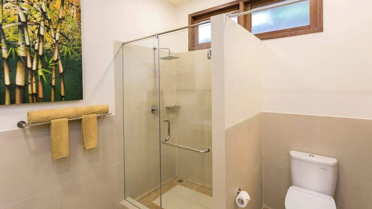 The modern bathroom offers cool separate air conditioning, a granite counter and a large rainshower.